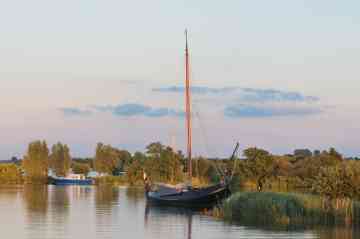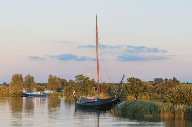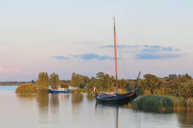 Mooie pastelkleuren krijg je net voor de zonsondergang. Dit schip ligt afgemeerd tegen het riet bij de brug bij Heerenzijl net zuidelijk van Terherne.
