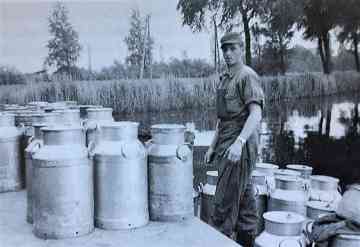 Andries (Dries) Sijszeling ( *1940) bij de zuivelfabriek in Easterein. Hij was