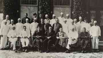Linksvoor: de botermaker, daarnaast de machinist, daarachter de kaasmaker en daarnaast de centrifugist.