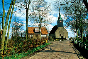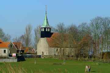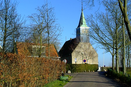 De dorpsstraat buigt naar de 13de-eeuwse bakstenen dorpskerk toe. In 1555 wilden de inwoners een leien dak; kennelijk ligt er dan nog riet op het dak en dat heeft te lijden van de stormen zo vlakbij de kust. Er wordt gemeld: ‘Pyanghum is nyet beplant met eenighe boemen’. De westgevel is vernieuwd en bij de restauratie van 1953 zijn de rondbogige vensters in het koor hersteld en het koor kreeg gotische spitsbogen terug. Aan de noordzijde zit een hagioscoop in het muurwerk.