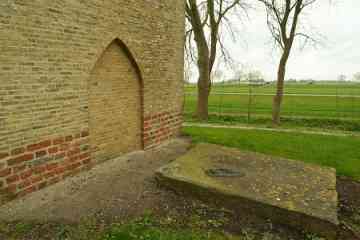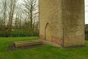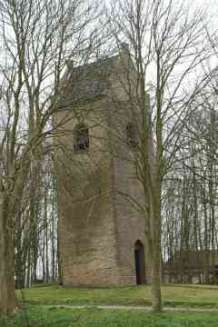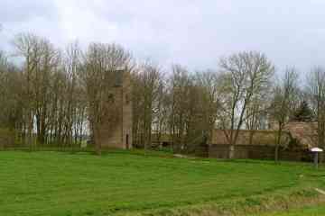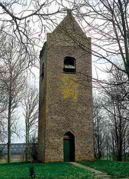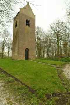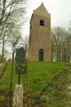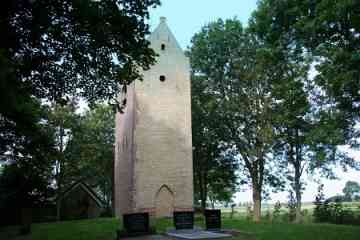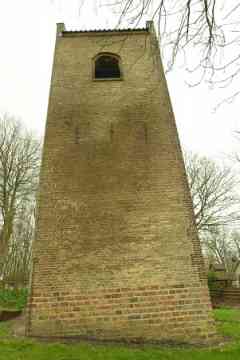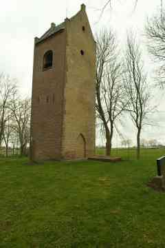 In het midden van de 19de eeuw weet het Aardrijkskundig Woordenboek: ‘Vroeger stond hier eene kerk, met een torentje, doch zonder orgel, welke omstreeks het jaar 1630 gesticht werd. Zij is voor eenige jaren afgebroken, doch de toren is alleen blijven staan.’ De kerk is in 1834 afgebroken: de kleine gemeenschap kon de onderhoudskosten kennelijk niet meer opbrengen. Ondanks zijn verweerde uiterlijk staat de toren er nog trots bij. Het is een kenmerkende zadeldaktoren met schouders op de hoeken en een ijzeren kruis op de naald. Aan de westzijde zit een eenvoudige deur in een nis die heel even spitsbogig is en aan de oostzijde is beneden een spitsboognis te zien. De toren is misschien al gebouwd in de 14de, maar waarschijnlijker in de 15de eeuw. Uit de Middeleeuwen is er maar weinig te zien, want de toren kreeg in de 19de eeuw een nieuwe mantel aangetrokken, aan drie zijden van grauwbruine en aan de oostzijde van gele steentjes. Onderin zitten oudere verrassingen: een soort plint van stenen in flinke afmetingen, moppen en rooswinkels die uit de late Middeleeuwen stammen. Het kunnen stenen zijn die hergebruikt zijn van de in 1834 afgebroken kerk.