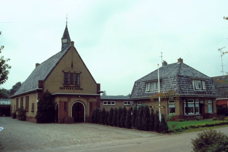 Het zaalkerkje, in de volksmond 'het lokaal', en de pastorie werden in 1928 ontworpen door M.O. Meek uit Donkerbroek in de zogenaamde Interbellumstijl. De plaatselijke aannemers K. en W. Ebbes bouwden het complex.