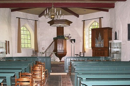 Binnen is de kerk nu gedekt door een vlak balkenplafond; in de wanden zijn de sporen van de vroegere overwelving nog te bespeuren. De inrichting is 19de- en 20ste-eeuws met hoogst eenvoudig meubilair, een doophek met gesloten panelen waarbinnen in de koorsluiting een preekstoel met klankbord en een kabinetorgel aanwezig zijn. Er staan twee vitrinekasten met vondsten uit de restauratietijd (1977). De kerk is eigendom van de Stichting Alde Fryske Tsjerken.
