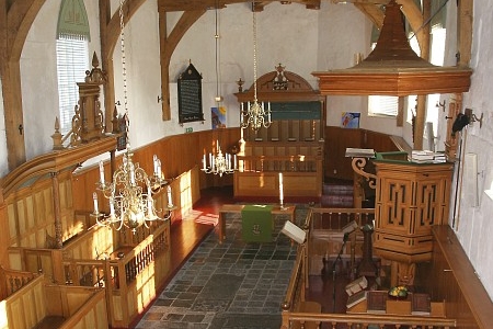 Het interieur wordt gedekt door een houten tongewelf van omstreeks 1500. De preekstoel met klankbord heeft traditionele vormen met gekorniste panelen op de kuip. Tegen de noordwand staat een overhuifde herenbank van de familie Glinstra–Bouricius met een bekroning van een aedicula waaruit de wapens zijn verwijderd. Tegen de koorsluiting staat een overhuifde bank in neoclassicistische vormen uit 1826. Daarbij hangt een memoriebord van de slag bij Boksum (1586). In de vloer liggen grafzerken waarvan die voor het echtpaar Worp van Juckema en Anna van Mockema (overleden resp. 1560 en 1585) zeer bijzonder is. Hij werd in 1561 gehouwen door Pieter Dircks en vertoont aan weerszijden van de nis met wapens de personificaties van Memoria en Gloria die wulps haar tuniek optilt. In een nis aan de bovenzijde zien we een levendig portret van astronoom Ptolemeus die de aardbol ophoudt en in de zwikken zijn putti met aan de ene zijde meet- en muziekinstrumenten en aan de andere zijde gereedschap te zien.