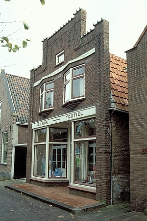 De voorgevel van de textielwinkel is in 1925 als een scherm voor een veel ouder pand met zadeldak geplaatst. De detaillering, zoals de kleursortering van de baksteen in de lisenen, is zorgvuldig uitgevoerd. Het winkelfront is een karakteristiek voorbeeld van een portiekpui, die de etalageruimte dieper maakte.