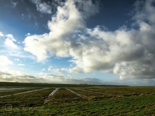 Wolken en zon strijden om een plekje aan de hemel boven de Skuorre bij Ternaard