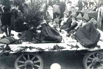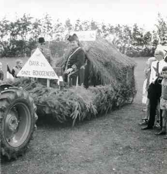 Hynder en wein wiene foar it doarpsfeest fan it grutste belang. Dat docht ek bliken út de folgjende foto der ’t de dwergen op in haaiwein sitte. De sydberjes (=zijschotten) binne fersierd mei wyt krêpepapier en dinnegrien.