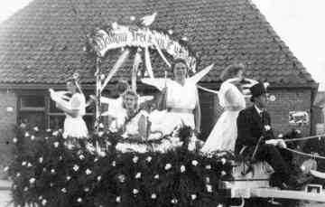 Doe ‘t de oarloch foarby wie moast der feest fierd wurde. De minsken hiene nei frede longere (= verlangd) en dat litte guon ek blike yn de optocht. It plak der ’t foto 1 nommen is sil jimme bekend wêze: it plein by it kafee mei de âld smidterij op de eftergrûn. Op de wein sitte mei it gesicht nei foaren as fredesdowen fan l/r Sjouk Bergsma – Meier, Anna Sjaarda – Kuipers, Kee Vellinga – Schukken. De fuorman is Minne Sjaarda dy ’t de leie yn de hannen hat.