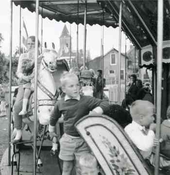 It feest fan 1963 wie bysûnder, want der wie foar it earst sûnt ein 19e iuw wer in draaimûne anneks sweef yn Easterein. Ein 19e iuw doe ’t de tsjerkestriid op syn fûlst wie hiene de ortodoks herfoarmen yn ‘e mande mei de grifformearden it foarinoar krigen dat der yn Easterein ‘nea’ wer sa ’n wurktúch fan de duvel komme soe. En yn 1963 stie de fertsjintwurdiger fan de duvel der wer: op de kopse kant fan it sportfjild mei de toer weitsjend (=wakend) op de eftergrûn mar ek mei de segen fan dominy Wolthuizen, de gereformearde dominy fan doe, dy ’t gjin inkeld beswier tsjin de draaimûne hie en syn gemeenteleden ek sa fier krige. It jonkje midden op de foto is Siep Sandstra, dy ’t letter it transportbedriuw fan syn heit oernommen hat. Ik soe net witte wa ’t de oare bern binne.