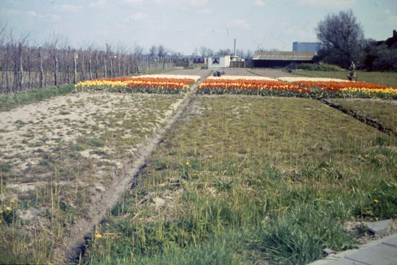 Langs de weg naar het Haagsche Schouw bij de Krom. Tulpenkoppen op het land van
