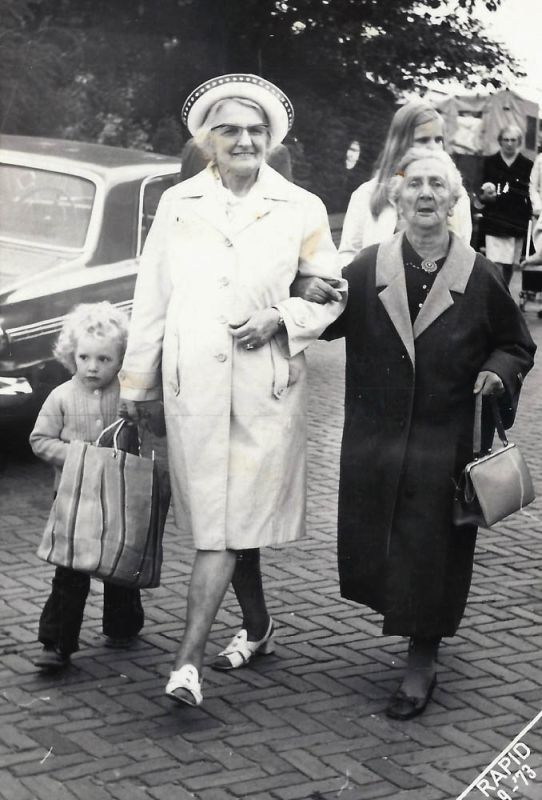 Paardenmarkt. mevr E. Brussee-Verhaar (1906-1990) met kleinkind Elsje en 'tante'