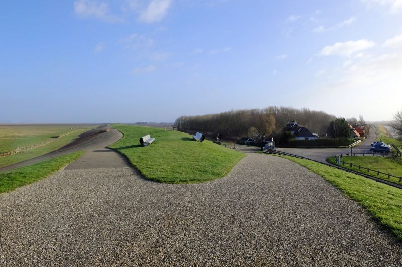 Verheven rijdend over de historische Oude- en Nieuwebildtdijk kom je in Zwarte Haan. Ik was er vandaag op een winderige dag aan het eind van januari 2024. In het gehucht zelf kun je niet verder. Er staat een hek met voetgangersdoorgang naar de dijk. Voor de dijk staat een monument genaamd “De Slikwerker”. Bovenop de dijk een gebogen stalen bank die herinnert aan Frieslands meest populaire, en helaas te jong gestorven, politica Anita Andriesen. Buitendijks een loopbrug als ware het een enorme aanlegsteiger.