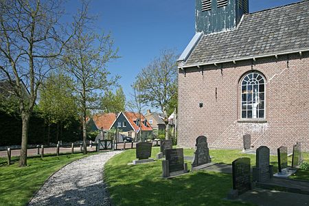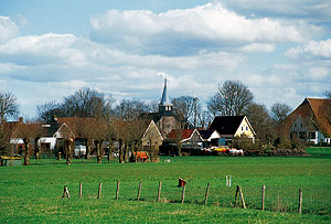 Bedeutendstes Gebäude des Dorfkerns rund um die Kirche ist das Pastorat, eine Mittelgangwohnung mit Säulen im Eingangsbereich. Die Kirche wurde 1870 gebaut und ersetzte ein älteres Gotteshaus. Weit sichtbar ist der hölzerne achteckige Kirchturm. Die bescheidenen Verzierungen des Kirchengebäudes sind charakteristisch für das Dorf.