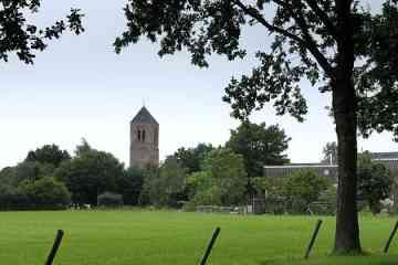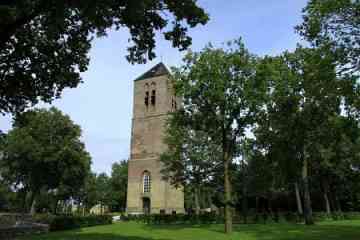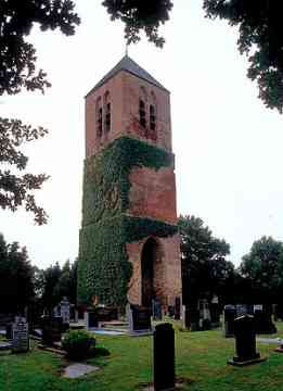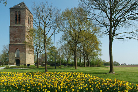 Bij een flauwe bocht staat op het oude, door zwaar geboomte omzoomde kerkhof een hoge, eenzame bakstenen toren. Oorspronkelijk hoorde die bij de aan het einde van de 18de eeuw gesloopte, middeleeuwse dorpskerk. De gotische toren dateert uit ongeveer 1370 en is omstreeks 1500 nog eens verhoogd. De toren heeft een vrij laag tentdak. De hervormde kerk is thans ondergebracht in de verbouwde, in 1899 tot stand gekomen openbare school.
