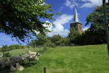 De dorpskerk, in de Middeleeuwen toegewijd aan Johannes de Doper, bezit een naar verhouding kloeke, ongelede toren met een ingesnoerde spits die uit 1807 dateert. De kleine, uit kloostermoppen gebouwde kerk stamt uit het begin van de 13de eeuw. Zij heeft een iets ouder koor met een driezijdige sluiting, waarbij de hoeken door schalken worden geaccentueerd. Ze zijn echter deels door grote, later opgetrokken steunberen verstopt geraakt.