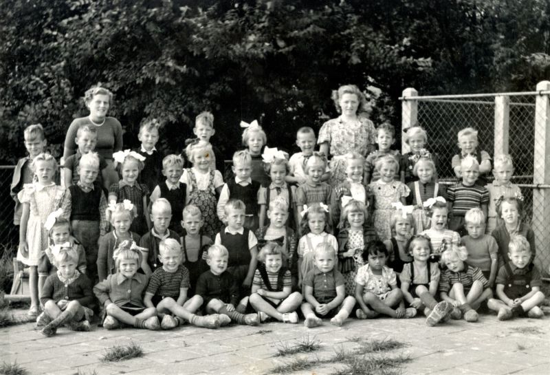 Op de foto boppe-oan stiet de klasse mei de lieding. Mei Tjerkje de Vries (Kooistra) ha ik de foto besjoen. Wy koene net alle bern thúsbringe, mar de nammen der ‘t wy fan tinke dat wy it witte folgje, somtiden mei in fraachteken en as wy it hielendal net wisten allinne in fraachteken.