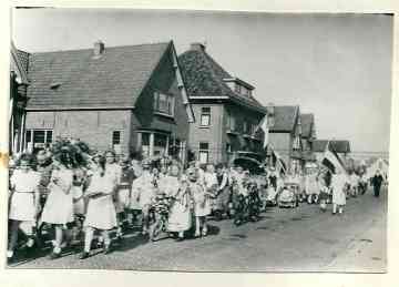 Oranjefeesten. De optocht op de Hoofdstraat langs de pastorie.