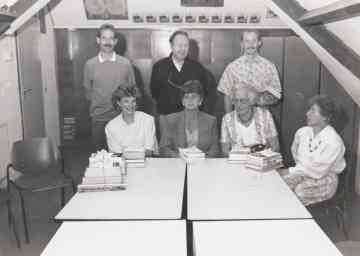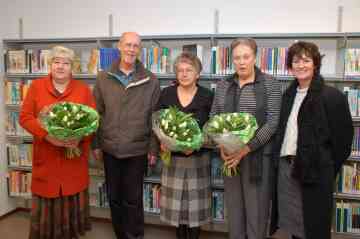 Afscheid van drie medewerkers van de bibliotheek. Van Links naar rechts. Lia Vis