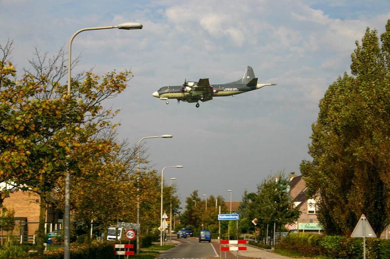 Lockheed P-3C Orion boven de Hoofdstraat voor de landing op vliegkamp Valkenburg