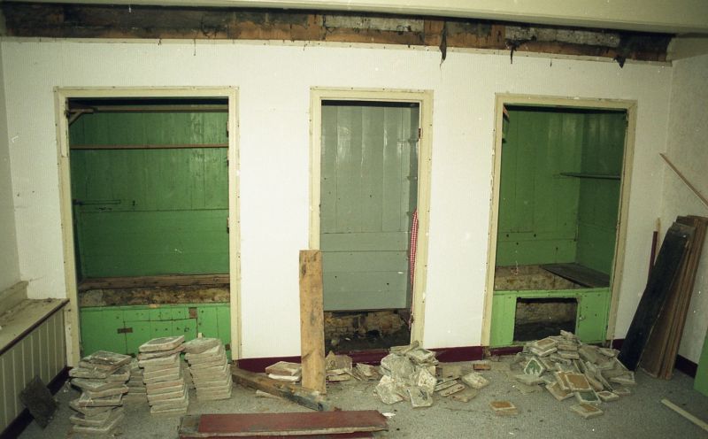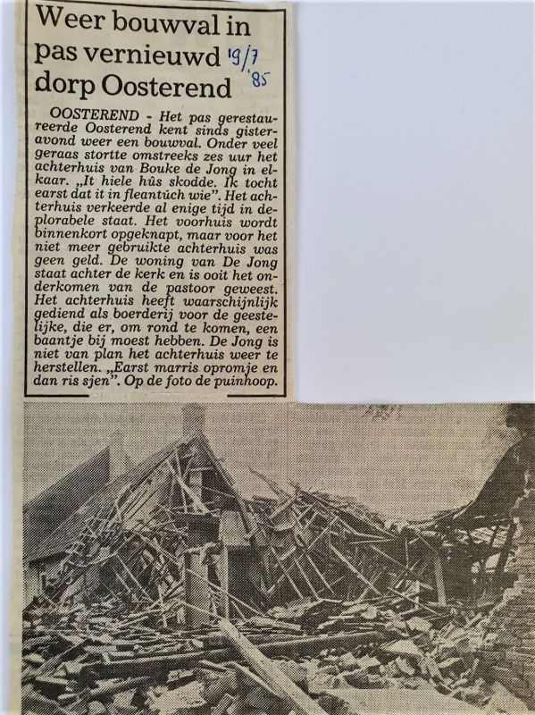 Tijdens een zware storm in 1985 stortte het deel de voormalige slagerij in en is toen afgebroken. Maar ook overleefde het bedrijfsgedeelte van het melkveebedrijf van de familie Bauke de Jong de storm niet. In de Leeuwarder Courant stond een foto van de ravage en plaatste er een bericht bij.