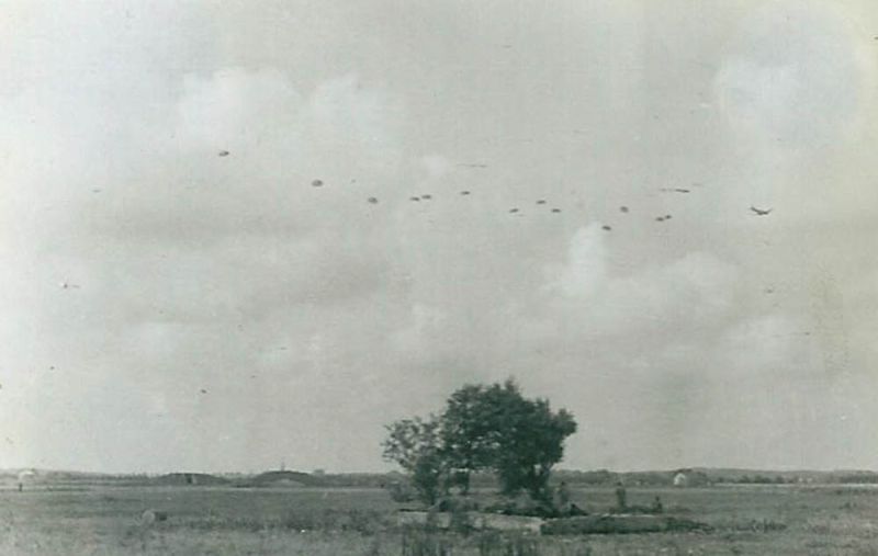 Militaire oefening op het vliegveld. Belgische parachutisten vallen het vliegvel