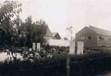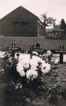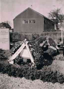 Militair graf met op de achtergrond de noodkerk van de Hervormde Gemeente