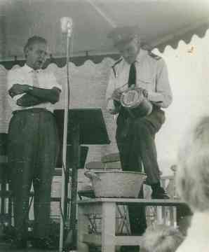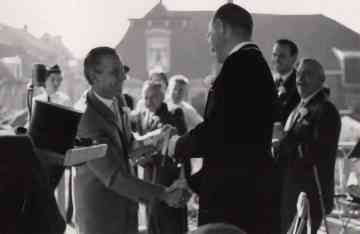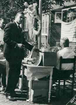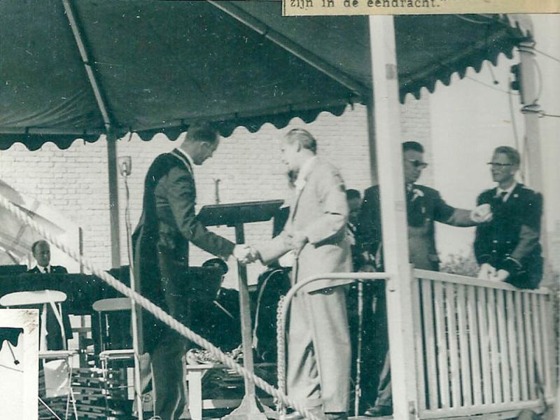 (4) Hier krijgt Cees Meurs een ferme handdruk van burgemeester van der Have, het