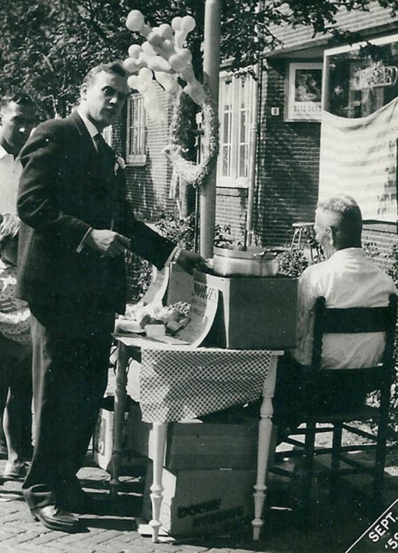 Tijdens de kinderoptocht met het Oranjefeest rijdt Cees Meurs met Joop van der N