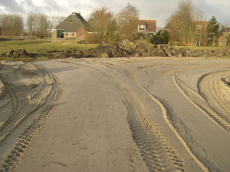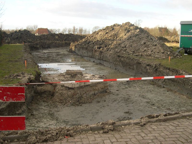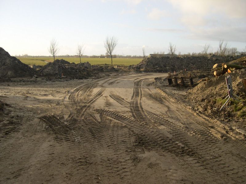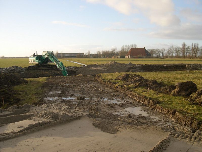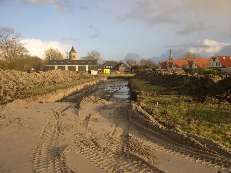 De dyk wurdt oanlein. Rjochts sjochst de huzen oan de Singel stean.