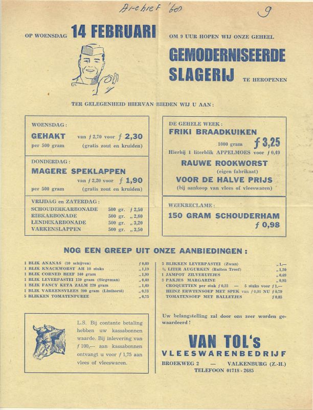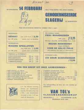 Slagerij van Tol aan de Broekweg adverteert met speciale aanbiedingen naar aanle