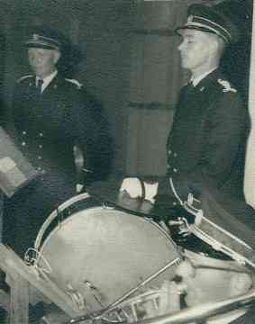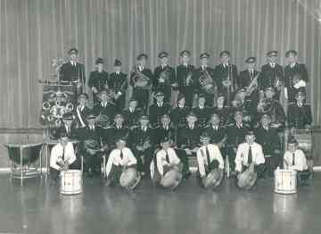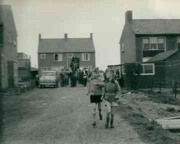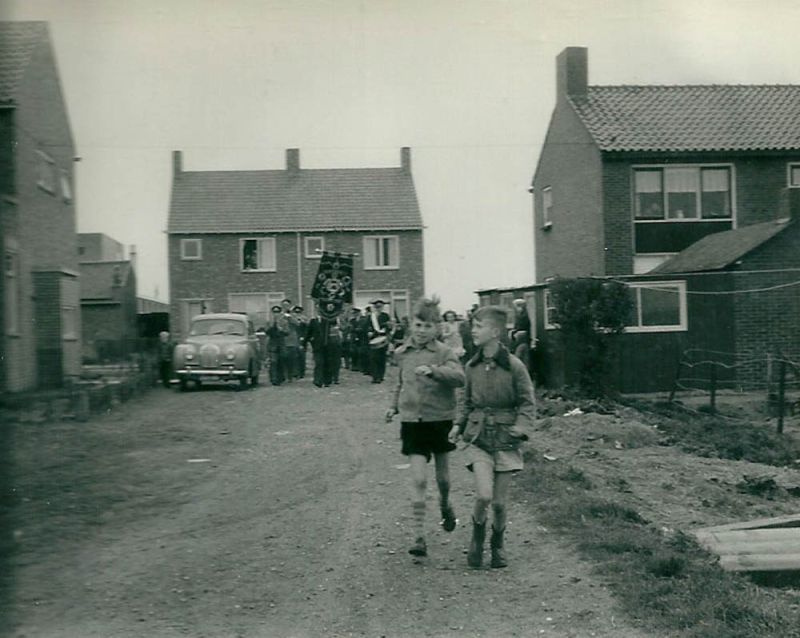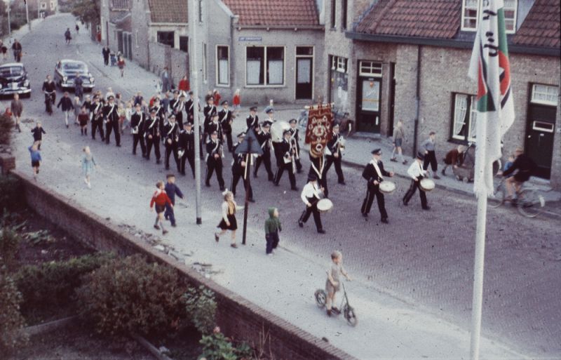 De harmonie op de Hoofdstraat. De foto moet van na juni 1957 zijn toen de harmon