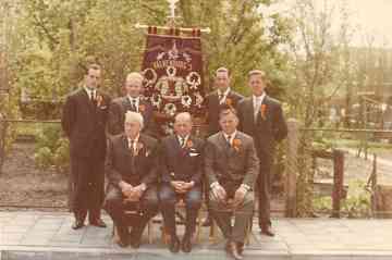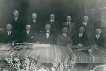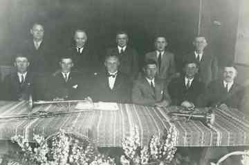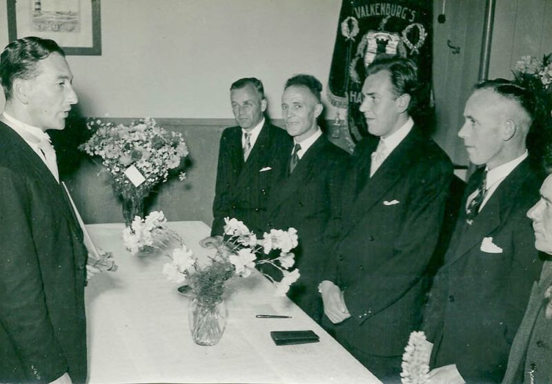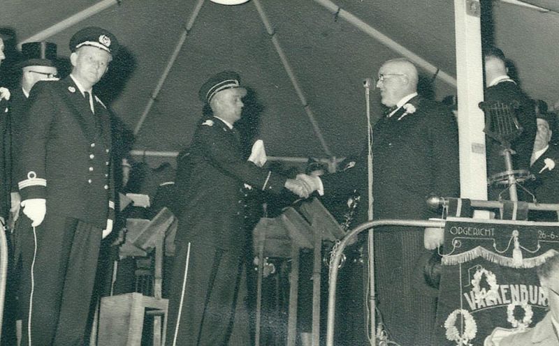 Links: Burgemeester van der Harst, rechts het bestuur van de 50-jarige harmonie