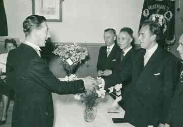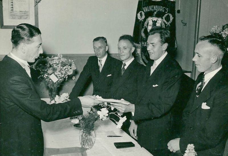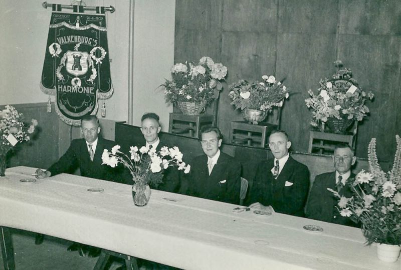 Burgemeester van der Harst en het bestuur van de 50-jarige Harmonie. V.l.nr. Pi