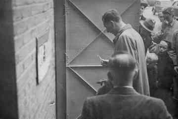 Burgemeester van der Harst met de sleutel van het spuitlokaal van garage Poot