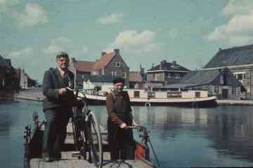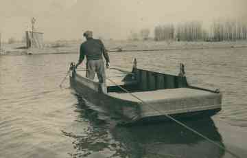 Tijdens de overtocht met de pont over de Rijn betaalt Jo Haantjes de pontbaas P.